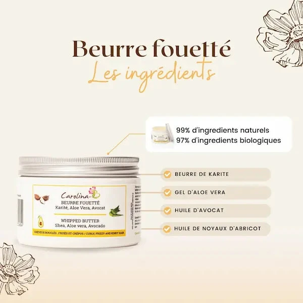 Ce Beurre Fouetté Cheveux et corps est exceptionnellement riche en Aloe Vera et Beurre de Karité pour une action hydratante, nourrissante, adoucissante et réparatrice.