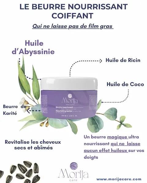 Le Beurre Nourrissant Morija Care est riche en acides gras et en lipides naturels qui pénètrent profondément dans la fibre capillaire : huile d’Abyssinie, huile de ricin et des beurres naturels karité et de coco…