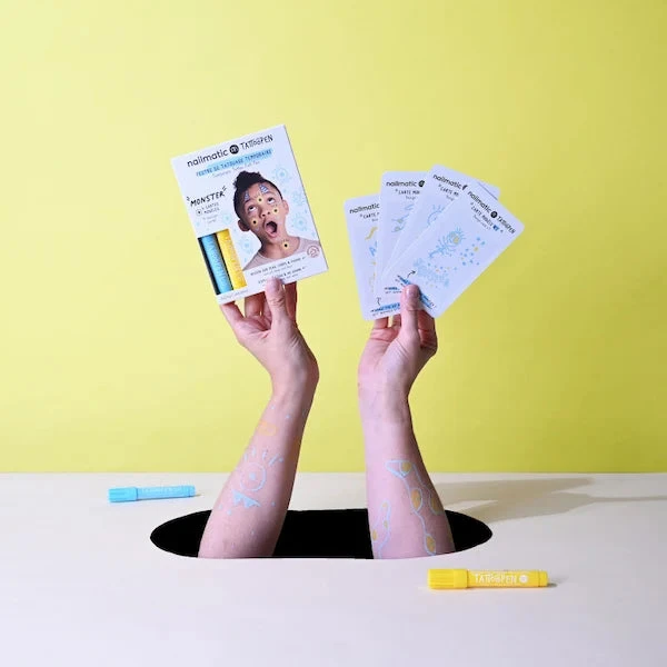 Avec des formules composées à 50% d’eau, les enfants peuvent exprimer leur créativité à cœur joie avec les 2 feutres de tatouages temporaires Tattoopen MONSTER, sans danger pour la peau.