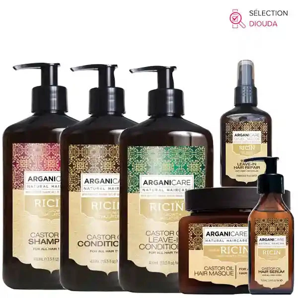 Retrouvez dans cette gamme Arganicare tous les soins capillaires à base d’huile de Ricin spécialement conçu pour les cheveux secs à très secs, cassants ou fragiles. 6 produits pour s’adapter à votre routine de lavage et embellir vos cheveux au quotidien :