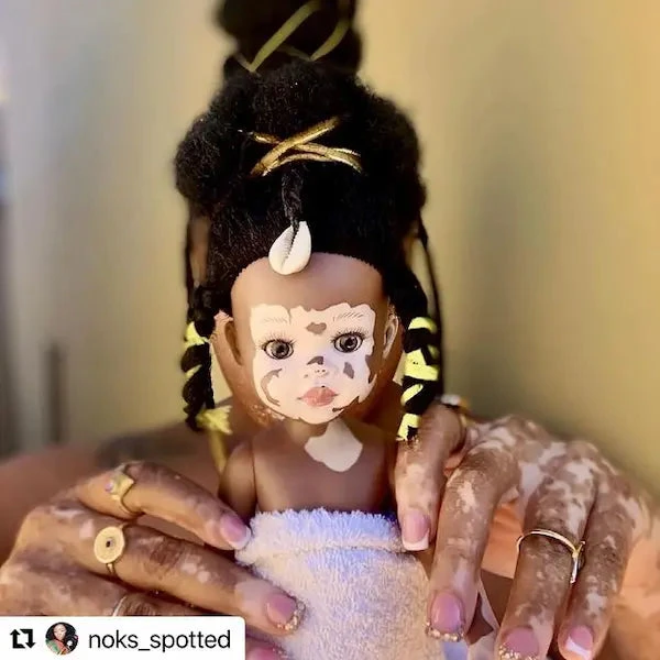 Moi, je viens d’Afrique du Sud. J’ai les cheveux afros, mais tu seras certainement étonnée par mon teint. Je suis atteinte de vitiligo et ma peau n’a pas une couleur uniforme.