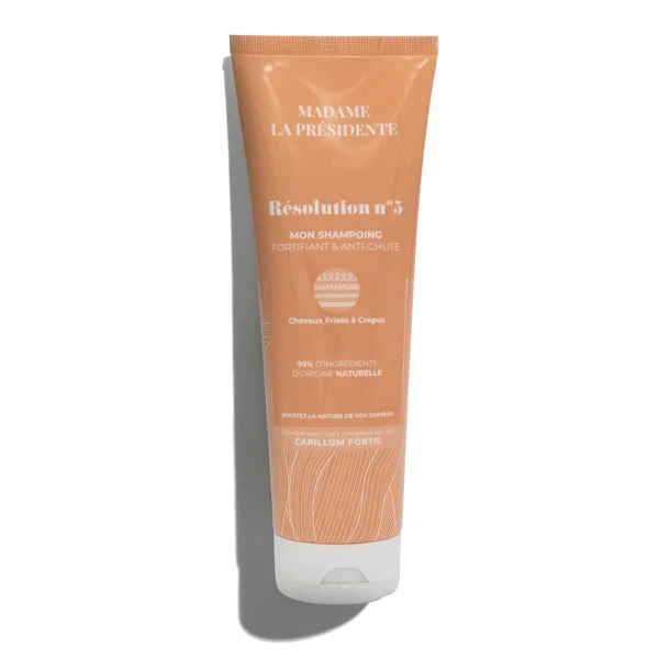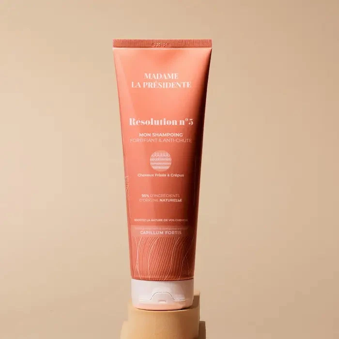 Le shampoing anti-chute Résolution N°5 de Madame La Présidente est composé à 95% d’ingrédients d’origine naturelle est enrichi en Capillum Fortis un mélange synergique de plantes qui stimule la circulation sanguine pour favoriser la croissance capillaire. Il renforce également l’ancrage des follicules capillaires, assurant des cheveux en meilleure santé dès la racine.
