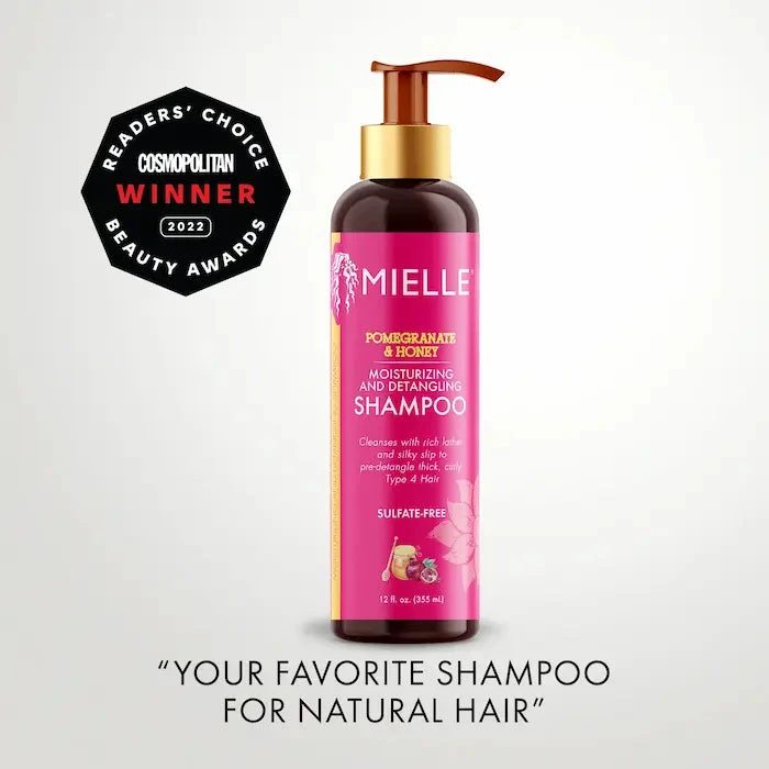 Le Shampooing Hydratant Démêlant Grenade & Miel MIELLE ORGANICS nettoie en douceur en respectant l’hydratation naturelle des cheveux.