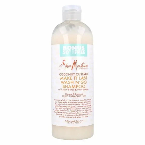 Le Shampooing Coconut Custard Make It Last Wash N’ Go Shampoo de Shea Moisture au karité et à la Crème de noix de coco pour cheveux afro 3B-4C produit une mousse de faible densité qui offre un nettoyage naturellement doux.